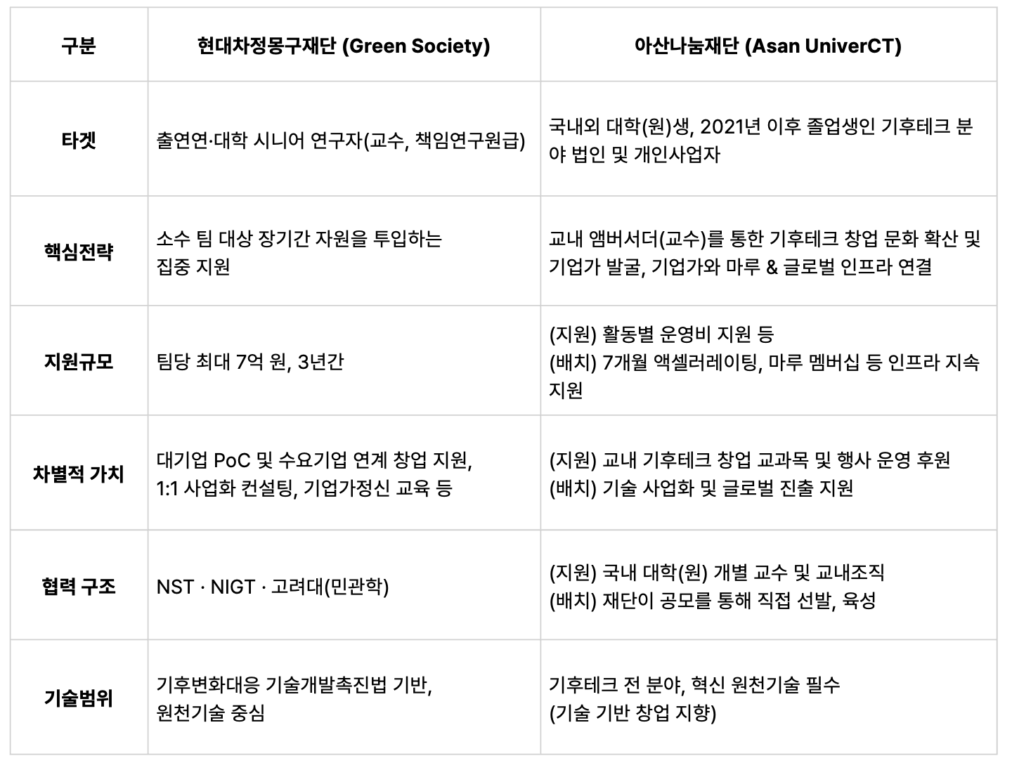 정몽구재단은 NST, 국가녹색기술연구소(NIGT), 고려대 등과 협력하며 연구 커뮤니티와 기후테크, 산업현장을 연결합니다. 아산나눔재단은 대학, 창업가, 투자자, 글로벌 네트워크를 잇는 기업가 생태계를 확장합니다.